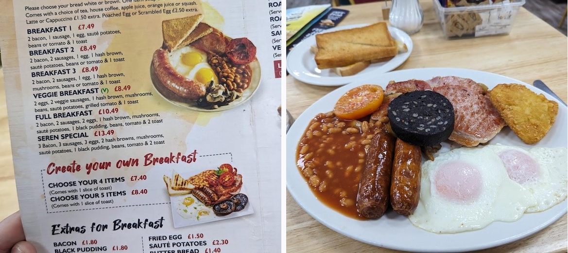 Loved the full breakfast (without potatoes). Excellent value for money for £10.49 with a cuppa. Everything cooked perfectly, especially the eggs and fried bread. Right next to the station so perfect if you need a quick bite to eat before catching a train.
